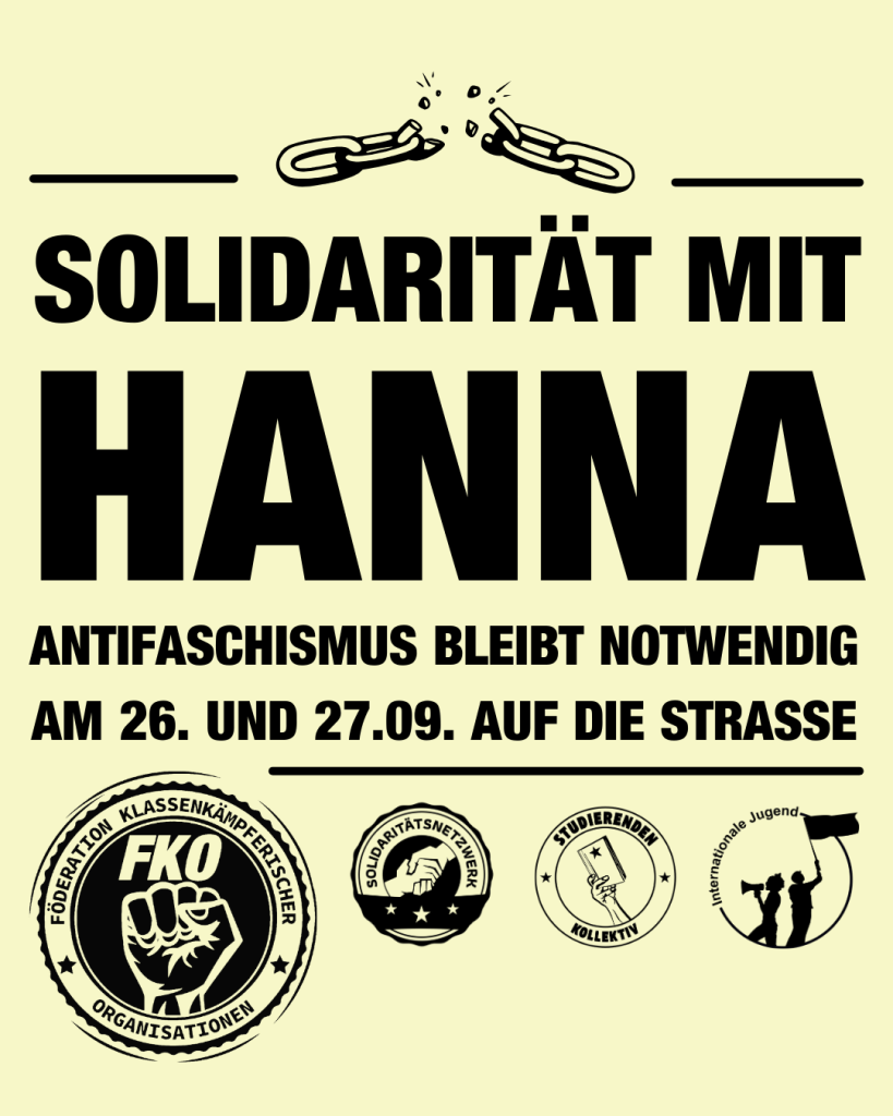 SOLIDARITÄT MIT HANNA! ANTIFASCHISMUS BLEIBT NOTWENDIG! AM 26. UND 27.09. AUF DIE STRASSE!
