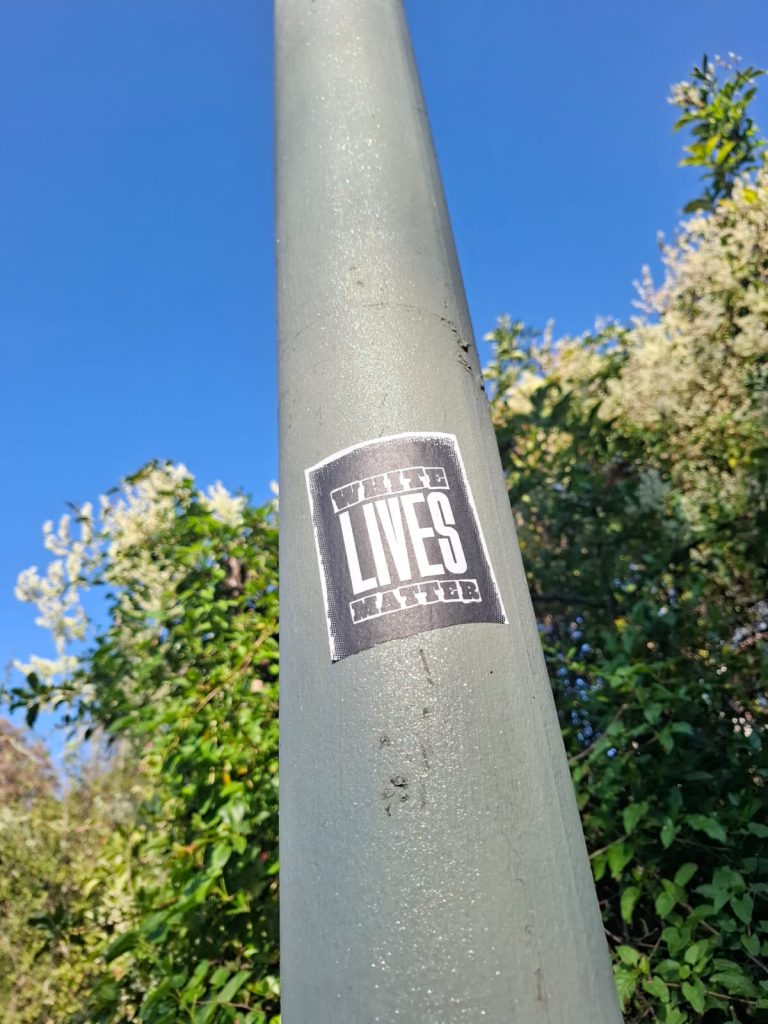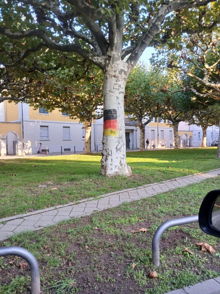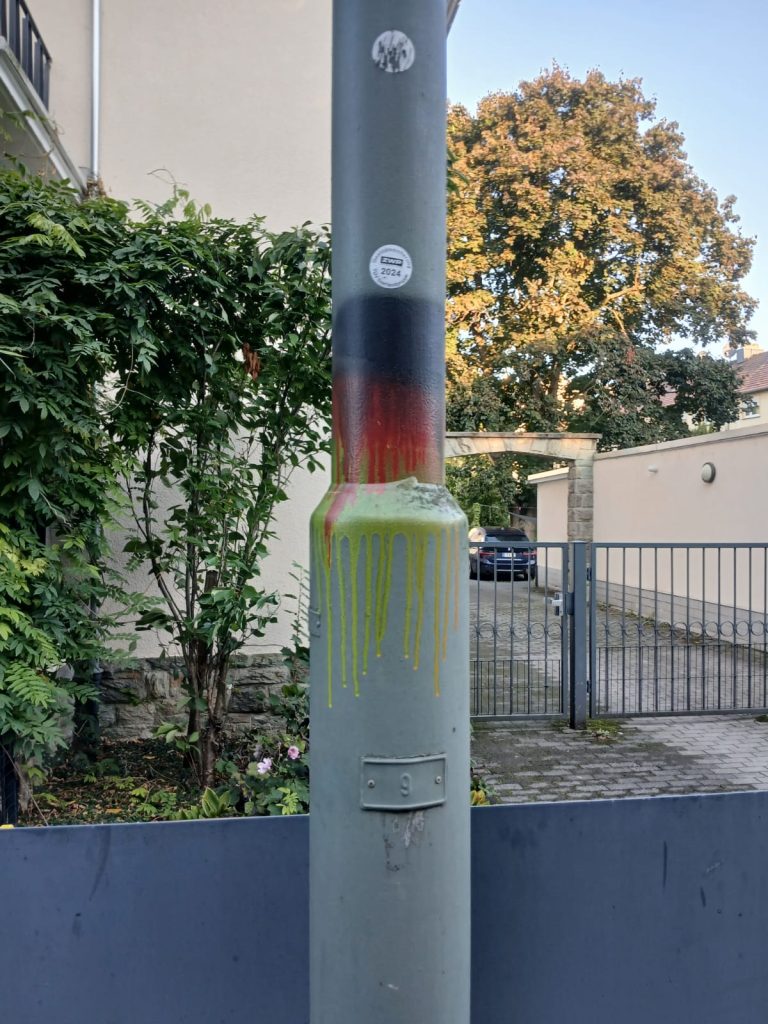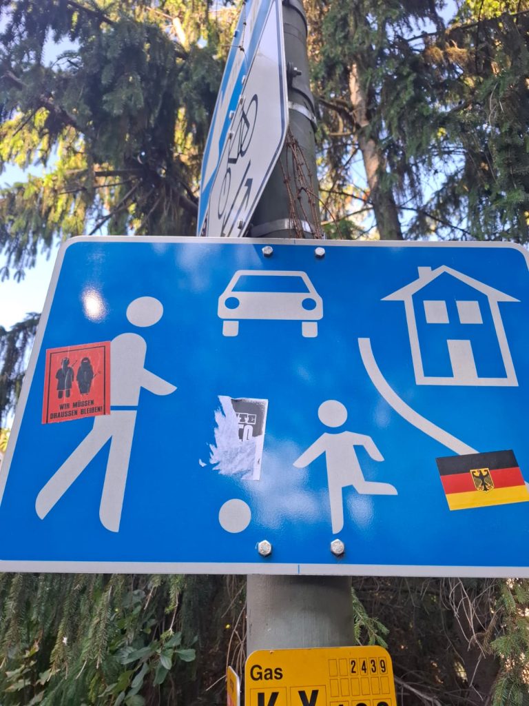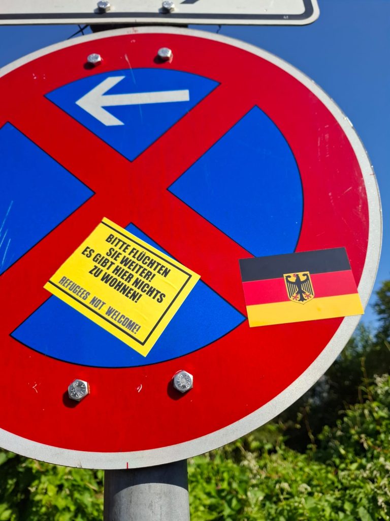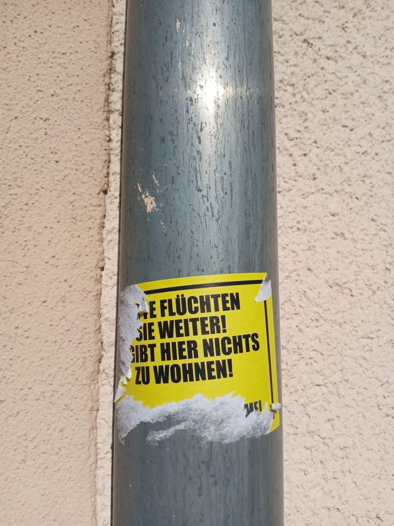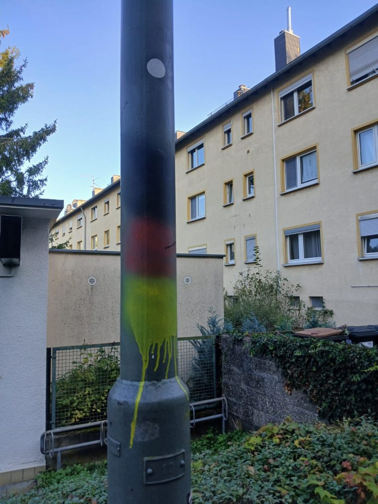 In den Straßen unseres Viertels sind vermehrt rassistische Sticker aufgetaucht. Parolen gegen Geflüchtete und Menschen mit Migrationshintergrund sowie Bilder, welche unter anderem eine Muslima mit einer Bombe zeigen, sind vielen Menschen übel aufgestoßen. Doch das war es noch nicht: Über all im Viertel wurden rechte Schmierereien angebracht und die Sticker sowie ein Meer aus Deutschlandwimpeln wurde mit einer extrem hautreizenden Chemikalie besprüht. Vermutlich um die Höchster:innen zu verletzen, die keine rechte Propaganda in ihrem Viertel haben wollen.