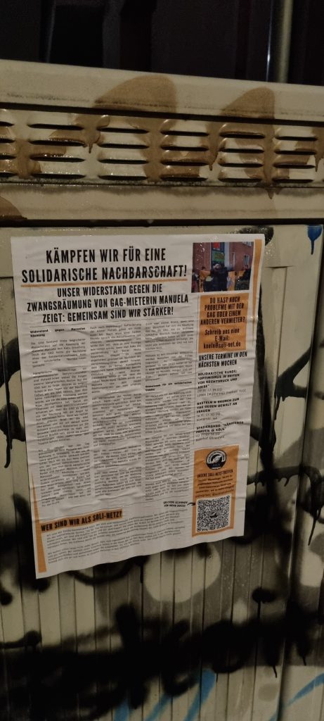 Die GAG bestand trotz beglichener Mietschulden auf die Räumung der Mieterin Manuela aus Köln-Gremberg. Doch die GAG hatte die Rechnung ohne das Solidaritätsnetzwerk Köln und solidarische Nachbar:innen gemacht.