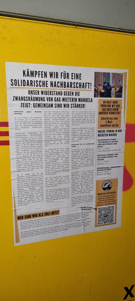 Nachdem wir im Oktober gegen Manuelas Zwangsräumung aus ihrer GAG-Wohnung aktiv waren, haben wir in den vergangenen Tagen eine Wandzeitung gestaltet, die ihren Fall noch mal aufgreift. Den Text teilen wir zudem unten. Uns ist wichtig zu betonen, dass Manuela kein Einzelfall ist – Zwangsräumungen sind in Deutschland und gerade in NRW trauriger Alltag geworden. Auch wenn wir die Räumung in diesem Fall nicht verhindern konnten, zeigen unsere Aktionen, dass wir Mietkonzernen und Polizei durchaus etwas entgegensetzen können.