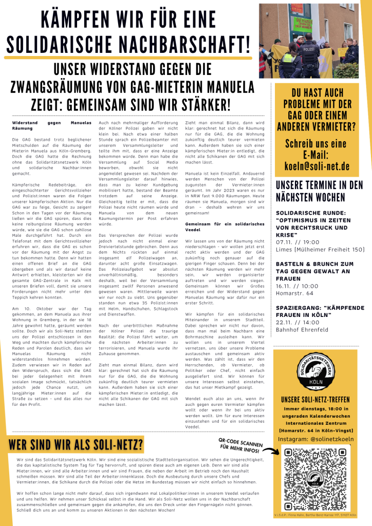 Am 10. Oktober war der Tag gekommen, an dem Manuela aus ihrer Wohnung in Gremberg, in der sie 18 Jahre gewohnt hatte, geräumt werden sollte. Doch wir als Soli-Netz stellten uns der Polizei entschlossen in den Weg und machten durch kämpferische Reden und Parolen deutlich, dass wir Manuelas Räumung nicht widerstandslos hinnehmen würden. Zudem verwiesen wir in Reden auf den Widerspruch, dass sich die GAG bei jeder Gelegenheit mit ihrem sozialen Image schmückt, tatsächlich jedoch jede Chance nutzt, um langjährige Mieter:innen auf die Straße zu setzen – und das alles nur für den Profit.